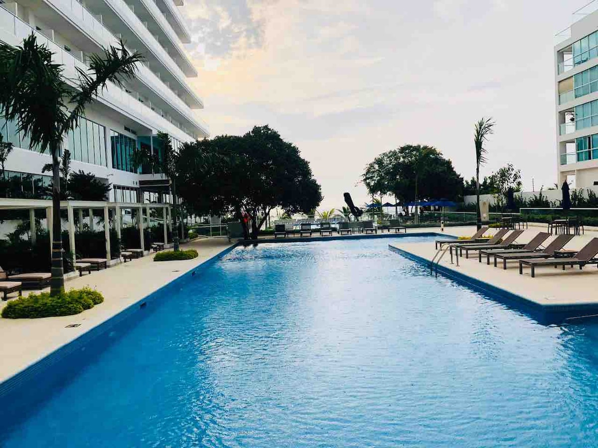 Stay at Samaria Club de Playa, an exclusive beachfront community in Santa Marta known for its tranquility and resort-style amenities. This bright and comfortable apartment is designed for a relaxing stay and features a private balcony with a pleasant lateral ocean view. Highlights 👉 Beachfront building with private beach access 👉 Multiple pools, including an infinity pool 👉 Gym and jacuzzi 👉 Private balcony with lateral ocean view 👉High-speed Wi-Fi 👉 Elevators and parking