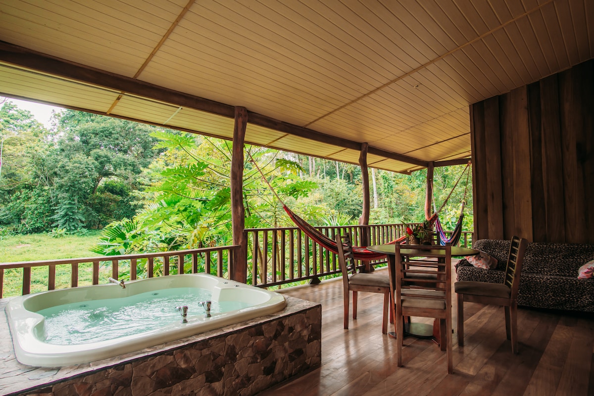 Stylish apartment made of tropical wood with big terrace overlooking a creek and the lush jungle.Hot water, equipped private kitchen,wi-fi, car parking,hammock,tour desk,bicycle rental,big garden with animals around.Your neighbors will be tucans,sloths,iguanas and lots of humming birds and butterflies. Do morning yoga on your deck overlooking the creek and toast the evening from this fabulous deck.