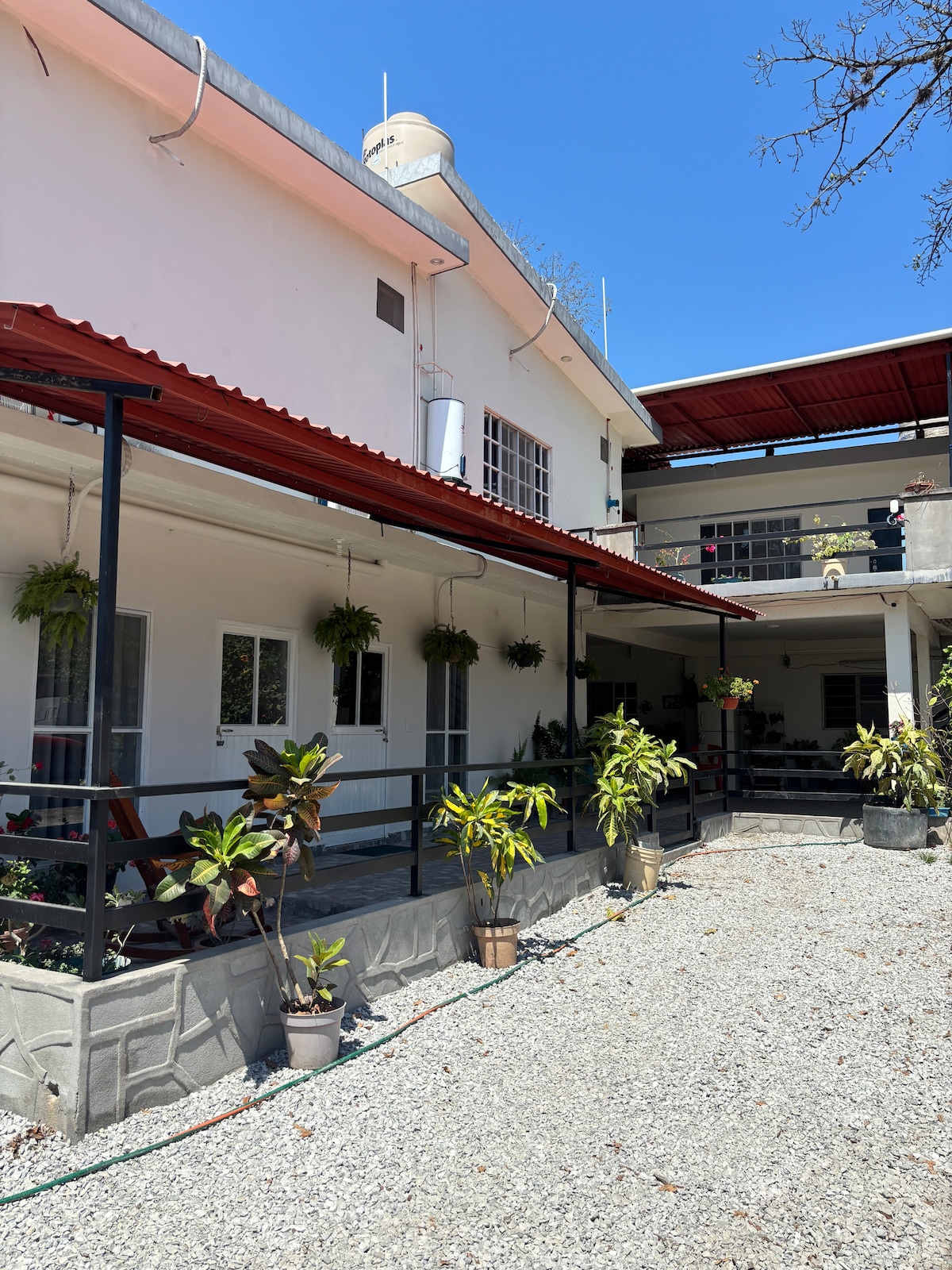 Si visitas Tamasopo por placer y/o trabajo, nuestro alojamiento cuenta con 2 terrazas, 2 habitaciones, 4 camas dobles, 2 baños completos y privados, wifi, TV, aire acondicionado y área para trabajar. En la primera terraza al salir de cada habitación podrás disfrutar de 2 salas, comedor, café y frigobar. En la 2a terraza, tercer piso, se encuentra el área para cocinar; mesas, camastros y amacas.