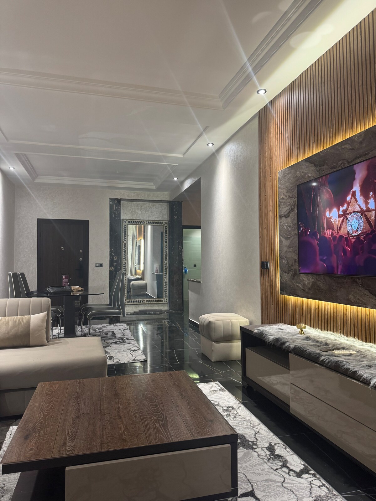 Willkommen in unserer brandneuen Wohnung mit zwei Schlafzimmern in einer erstklassigen Gegend von Tanger. Diese gehobene Unterkunft befindet sich in einer der begehrtesten Gegenden der Stadt mit einem 24-Stunden-Concierge und ist nur 10 Gehminuten vom Bahnhof, der City Centre Mall, der Ibn Battuta Mall und den Stränden entfernt. Es bietet sowohl Komfort als auch Luxus vor der Haustüre. Privatparkplatz vorhanden. Die Wohnung verfügt über: Glasfaser-WLAN, eine Option für Chauffeur und ein marokkanisches Frühstück, das von unserer Gouvernante zubereitet wird (zusätzliche Kosten)
