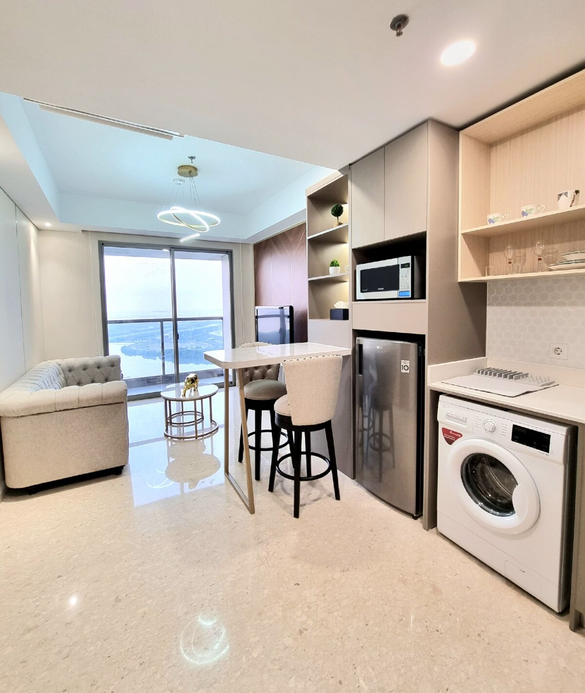 Eine geräumige, gemütliche 1-Zimmer-Wohnung mit einem Wohnzimmer und einem Balkon im Citralake Suites, West-Jakartas idealer Ausflugsort am See. Günstig gelegen, nur wenige Minuten vom Flughafen, PIK, Puri Indah und Sunset Avenue entfernt, ist es einfach, die Stadt zu erkunden. Geh nach draußen und du bist nur 1 Gehminute von Ciffest entfernt, einem lebendigen Essbereich mit vielen Speisemöglichkeiten, Supermärkten und Geldautomaten. Unsere 1-BR-Einheit bietet einen luxuriösen und komfortablen Raum für bis zu 3 Gäste, mit einer Küchenzeile, kostenfreiem WLAN und Netflix.