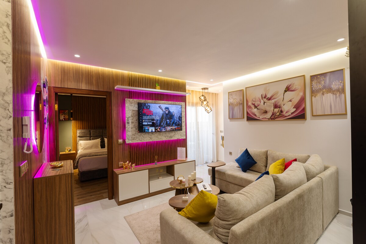Cet appartement Airbnb de luxe propose deux chambres climatisées, une PlayStation 5, Netflix, des toilettes équipées de luxe, une cuisine très bien équipée, et deux télévisions haut-de-gamme avec une connexion fibre optique ultra-rapide. entièrement climatisé, assurant un confort optimal dans toutes les parties de la maison. Profitez d'une atmosphère agréable tout au long de votre séjour. Ajoutant à votre confort, l'appartement offre également un parking intérieur gratuit dans l'immeuble.