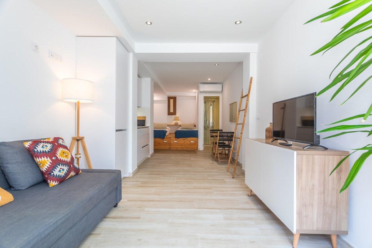 Estudio moderno, coqueto, decorado con encanto y muy funcional. Recién construido, muy céntrico, cerca de todo, la playa a 5 minutos andando, casco antiguo a 3min, dos grandes supermercados a 100-150 metros, gran zona de parking a 150 mt. Zona tranquila, ni disco ni pubs cerca. Cocina totalmente equipada Cama canapé doble grande de 1,50 mt y un sofá cama chaise longue. Hay dos splits de aire acondicionado para frío y calor, persianas eléctricas, video portero. Dispone de smart tv y wifi.