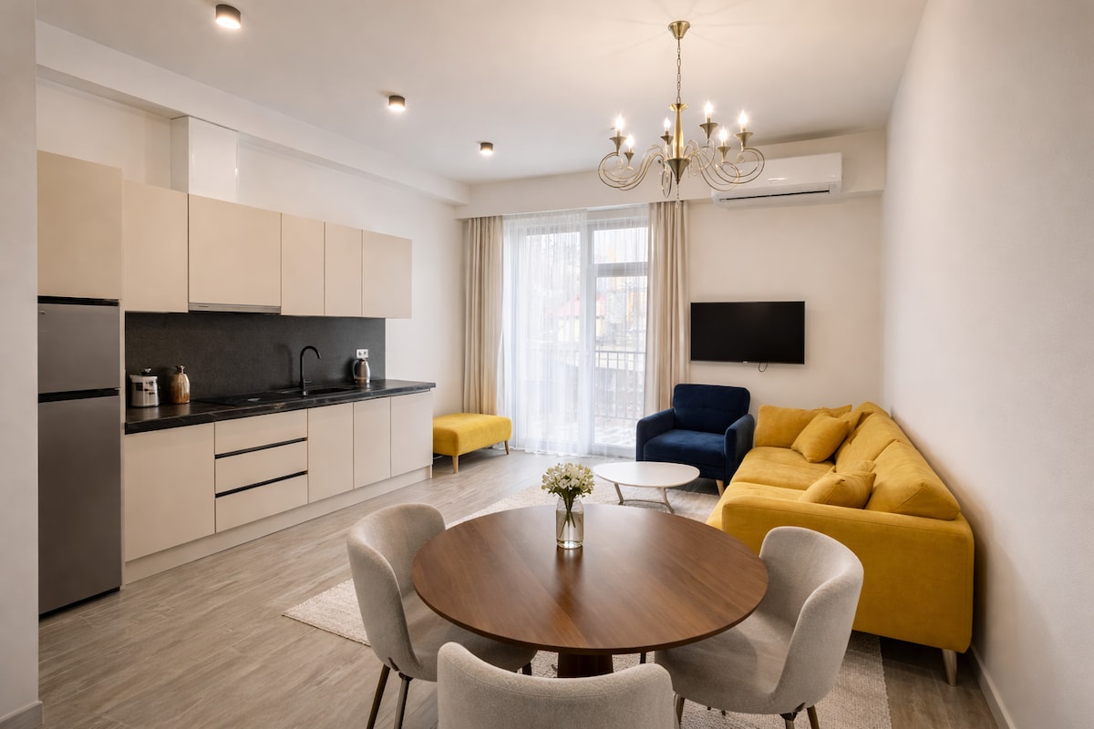 Modern, thoughtfully designed apartments in a new residential building. The bright, calming interior, fully equipped kitchen area, and well-planned layout provide comfort for both short stays and longer visits. This format is rare in Dilijan, offering a level of convenience that is hard to find in the city. A large grocery store is nearby, and the Central City Park is within walking distance, offering a relaxed walk through the town.