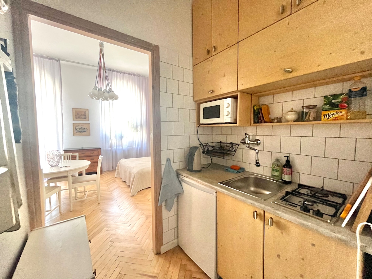 * Studio. 39m2 of space, freshly designed/renovated in art deco building from 1938. * Comfy for 2 ppl, up to a max of 4. No pets. High flat. Internet up to 100 Mbps. * Very good location, easy access to all interesting places worth visiting. Silence. * Comfortable bed 160x200, fully equipped kitchen, big table, balcony, large bathroom. No TV * Pubs, bars, clubs, restaurants, shops, exhibitions, cafes, theaters . . . * Streets full of people until late at night * I can issue a bill -VAT invoice