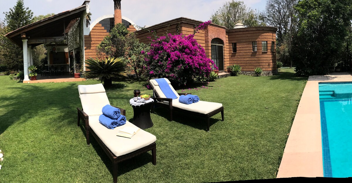 Beautiful house surrounded by nature, pool and jacuzzi, spectacular views, terraces and fountains, you will feel in the countryside, you are just 8 min. walking to the Plaza of Malinalco. The architecture of the house integrates with nature, along with a beautiful decoration. It has all the comforts and equipment. The San Juan neighborhood is the safest in Malinalco. * One pet is allowed, you should consult first and know the pets policy.