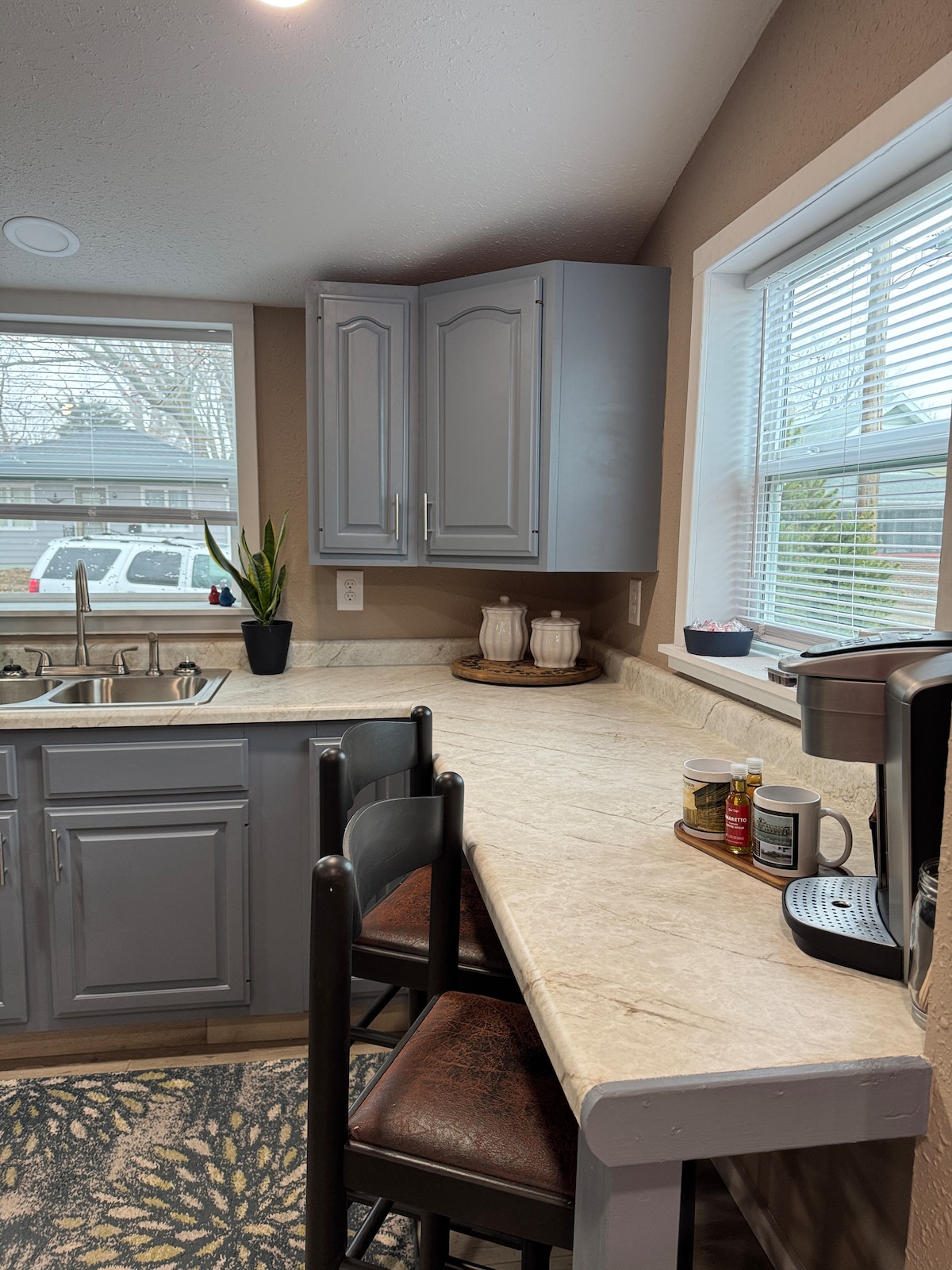 Welcome to The Blue Pearl— a bright, remodeled 2BR/2BA home in Macomb! Sleeps 6 with 2 queen beds + sleeper sofa. Pet-friendly with fast WiFi + workspace, fully stocked kitchen, washer/dryer, 2 Roku TVs, private deck space with fire table, games and books for relaxing with family and friends, and attached 1-car garage. Convenient to WIU, Amtrak, downtown, and just 2 blocks to the hospital. Great for families + extended stays.