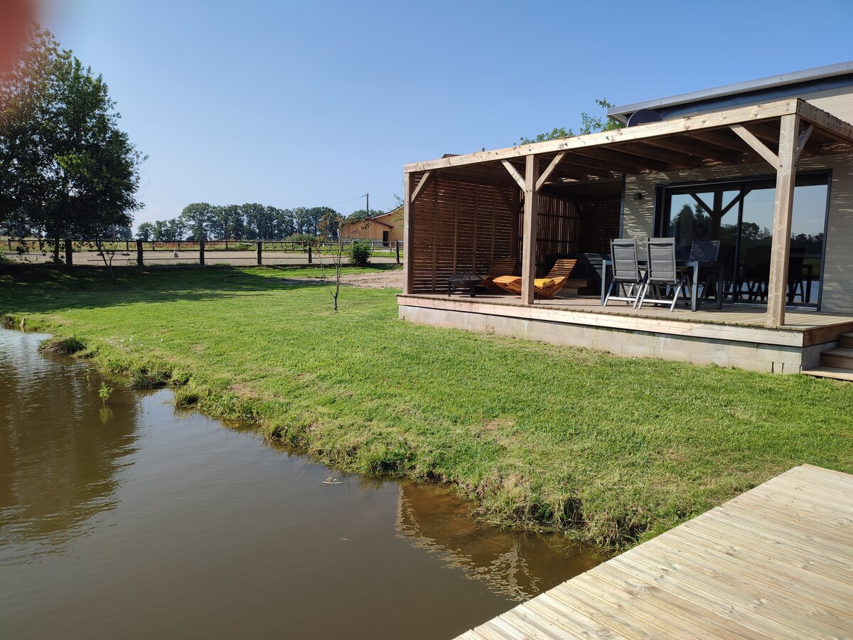 Lodge in einer natürlichen Umgebung, um Entspannung und Ruhe zu gewährleisten. Entworfen mit hochwertigen Materialien im skandinavischen Stil, ist es komplett für Ihren Komfort ausgestattet. Zwei große Fenster bieten Ihnen einen atemberaubenden Blick auf den Teich und die umliegende Natur: ein Eintauchen in die lokale Flora und Fauna für einen völlig exotischen Aufenthalt.