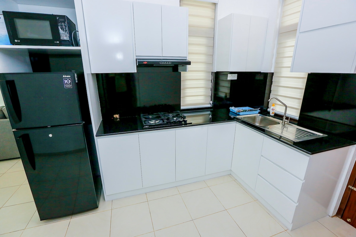 Willkommen in unserer modernen Wohnung! Übernachte in dieser stilvollen Unterkunft mit luxuriösem Komfort. Die Wohnung im vierten Stock verfügt über einen geräumigen Wohn- und Essbereich, eine voll ausgestattete Küche und zwei gemütliche Schlafzimmer mit eigenen Badezimmern und Balkonen. Waschmaschine/Trockner, um deine Wäsche zu waschen. Privatparkplatz, Aufzug, malerische Dachterrasse und voll ausgestatteter Fitnessraum. Entspann dich mit einem Sicherheitsdienst rund um die Uhr. Günstig in der Nähe von Supermärkten, Restaurants, Joggingbahnen und Krankenhäusern gelegen. Kurze Entfernung zur Schnellstraße.