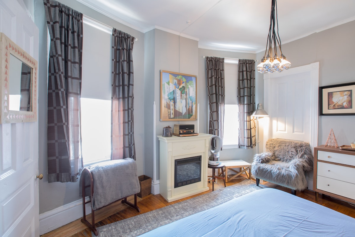 Willkommen in unserem charmanten Studio im 3. Stock, das sich in einem viktorianischen Haus im Herzen des NE Arts District befindet! Dieser gemütliche Rückzugsort bietet eine Fülle von natürlichem Licht, das durch Oberlichter strömt und einen Raum beleuchtet, der mit schönen Pflanzen geschmückt ist und ein ruhiges und einladendes Ambiente schafft. Diese herrliche Oase verfügt über einen warmen Kamin, der sich perfekt für kühle Abende eignet. Bitte beachte, dass es einen geringen Freiraum in der Nähe des Bettes und im Badezimmer-/Küchenbereich gibt.