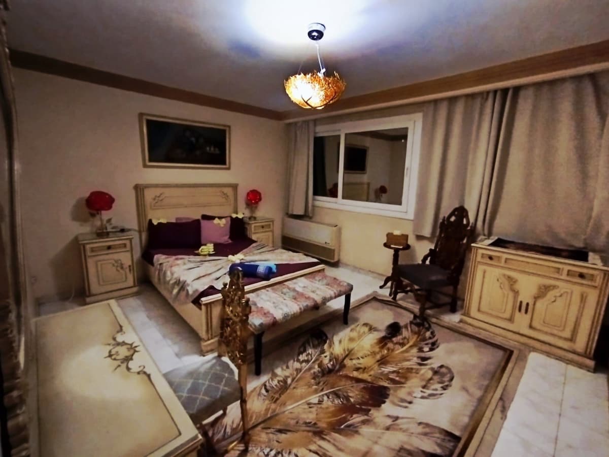 Willkommen in unserem charmanten 1-Schlafzimmer in Gizeh, wo du von deinem privaten Balkon aus einen spektakulären Blick auf die großen Pyramiden genießen kannst. Mit einem gemütlichen Bett und einem angrenzenden Badezimmer ist dieser Raum perfekt für die Entspannung nach einem Tag voller Entdeckungen. Unser Apartment liegt nur 5 Fahrminuten von den Pyramiden von Gizeh und dem Großen Ägyptischen Museum entfernt und ist auch nur wenige Gehminuten von entzückenden Restaurants, Cafés und Supermärkten entfernt. Genieße ein kostenloses Frühstück in unserem Café auf dem Dach.