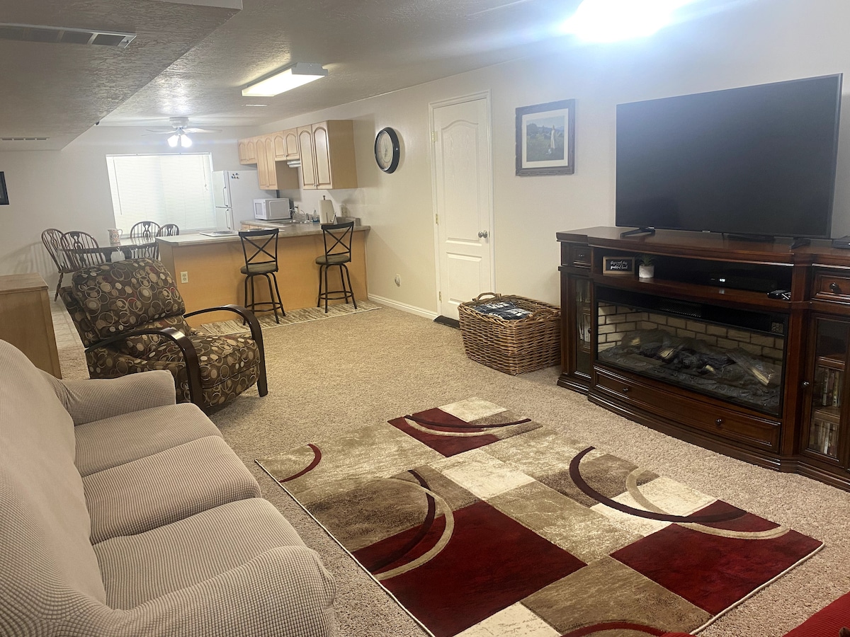 Bring the whole family to this great place with lots of room for fun! Entire basement suite with single car garage. Theater room for the tired nights of traveling and feel like playing games or watching a movie.Queen bed and memory foam futon bed. Wet bar w/ microwave, air fryer, mini fridge, coffee maker, Free wifi, Washer Dryer, Fireplace. Enjoy this unique basement designed for relaxing and having fun! 900 sq. ft. all to yourselves! Minutes from Usana amphitheater, Airport, and Downtown SLC