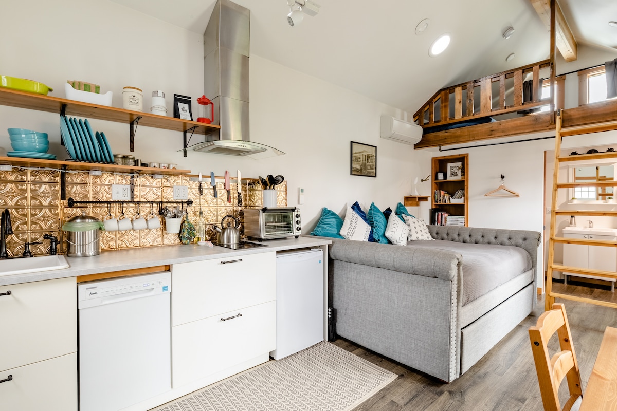 Private cottage with views of the garden. High ceilings, lots of natural light and warm accents. Stocked kitchenette. Four, friendly cats waiting to visit in the garden and three, suspicious, but friendly, hens in the chicken coop. Tranquil garden with fruit tees, flowers, bubbling fountain, chimes, and sheltered, cozy seating. Nearby food, drink, shopping and recreation options. Local recommendations. Your home away from home! Ask about renting our 2023 Toyota Sienna, hybrid minivan.