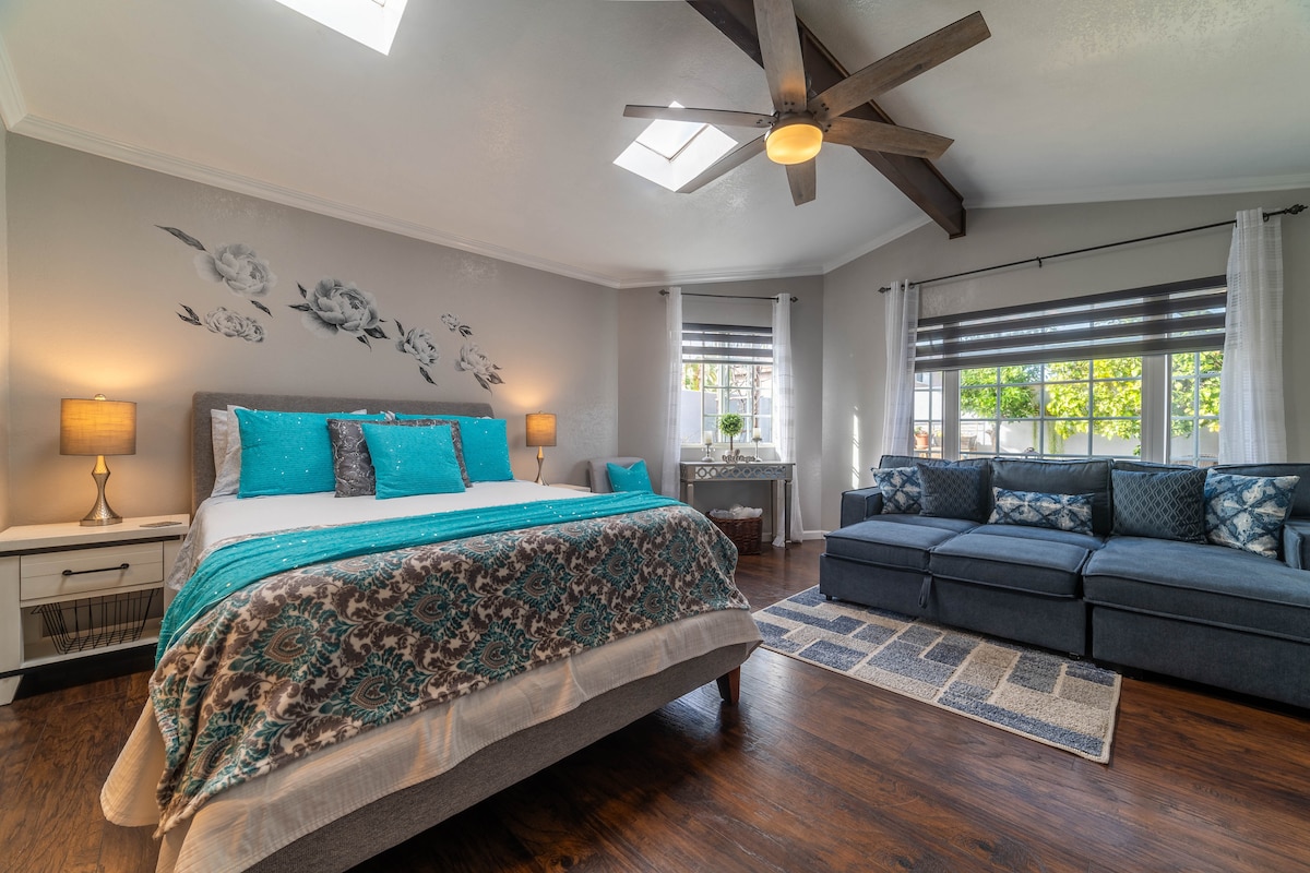 This unit has a unique style of its own. It’s fully black which makes it perfect to relax, and binging on your favorite movies/series. King size mattress and 75” TV *AC/Heater *Fast Wifi *Everything on pics fully PRIVATE Enjoy the beautiful sunset from our two-person bathtub & Terrace (Best view in the area!)🌅 Outdoor Kitchen 🍳/ Living Room with fire pit & MovieTheater! 🎥 Located inside a gated residential (24/7 security) Walking distance to local bars, Restaurants, and MalibuBeach(~1mile)