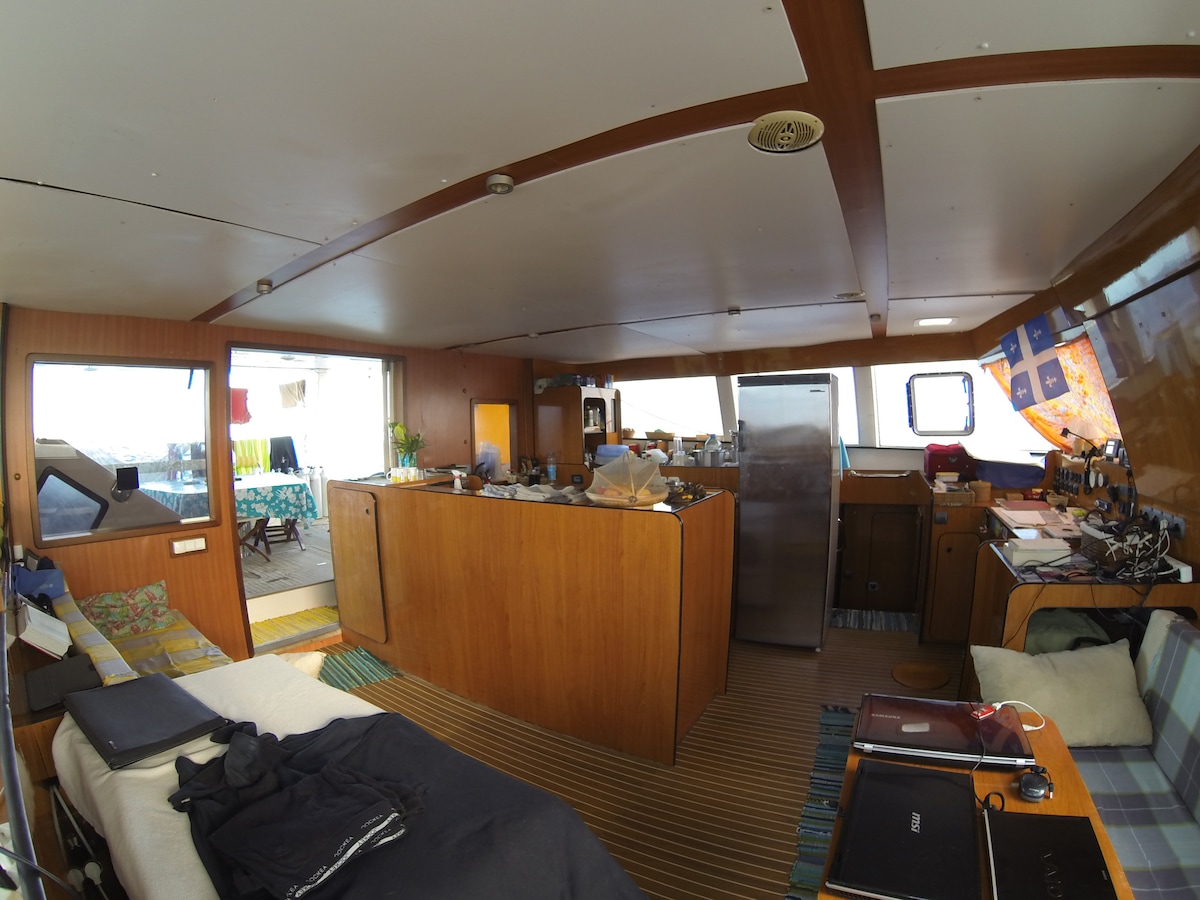 Einzigartig! Vor dem Dorf. In der Nähe von TAUCHZENTREN für NORD und SÜD, Geschäfte, Snacks, Strand. ZUGANG ZUM LAND NACH BELIEBEN. Entdeckung: Schnorcheln, Angeln, Radfahren, Ausflug. KOSTENLOSER TRANSFER. Frühstück inklusive / Mittag- oder Abendessen @33 € - SPEZIALMENÜ ohne Gluten, Laktose, vegan - Großer Katamaran 18 Meter mit den Besitzern und 2 kleinen Hunden. KEINE MÜCKEN - RUHE - Umweltbewusst: Recycling, autonom in Wasser und Solarenergie - KOSTENLOSES 4G WLAN - 4 Kabinen mit Doppelbett/privatem Bad für max. 8 Personen.