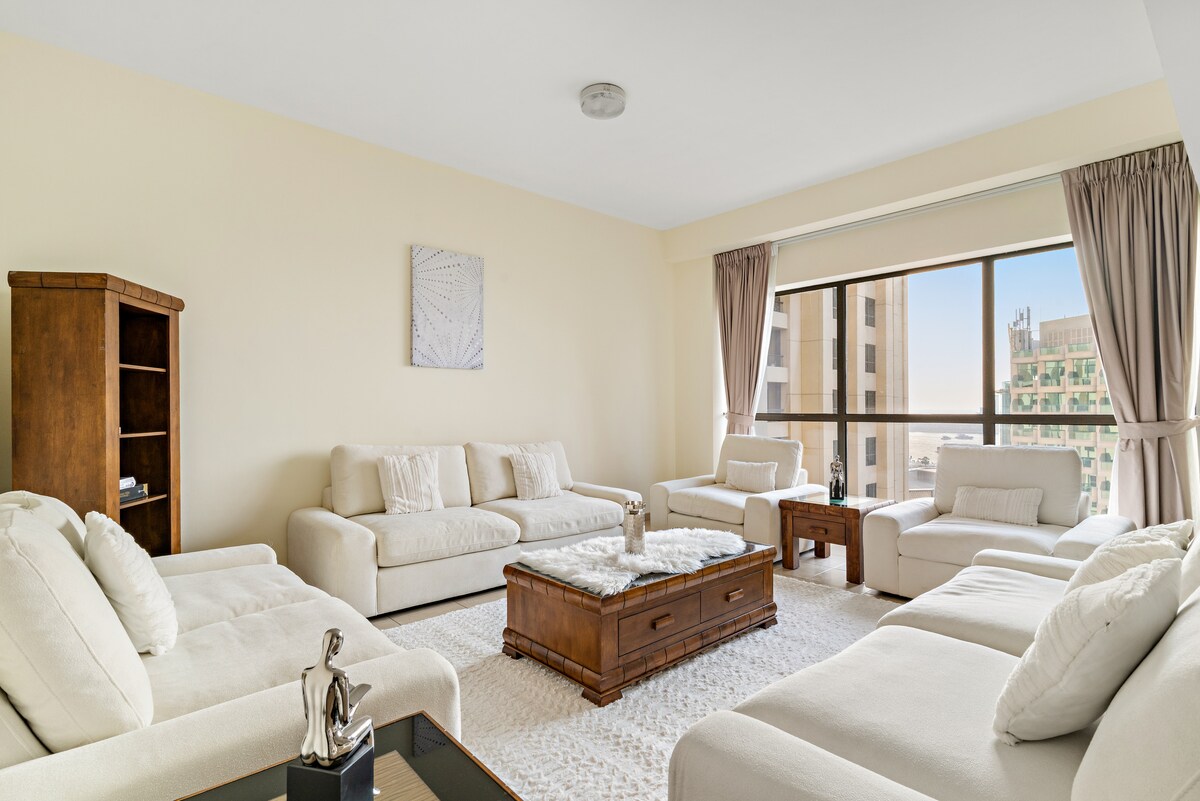 Wake up to breathtaking sea views and the iconic Ain Dubai right from your window. This spacious 2-bedroom apartment is just a 2-minute walk to JBR Beach and comfortably hosts up to 8 guests, perfect for families and groups looking for space, location and value. Located in the heart of Jumeirah Beach Residence, you’re steps away from The Walk, restaurants, cafés, supermarkets and beach clubs.