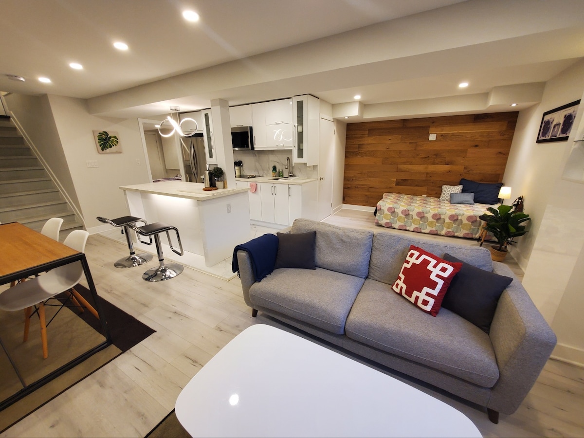 Erlebe Wohnen im Cottage-Stil in dieser renovierten, möblierten und geräumigen (ca. 93 m²) Suite auf der unteren Ebene eines 3-stöckigen Hauses (Keller) auf einem Grundstück in einer privaten Sackgasse. - Separater Eingang - Zwei Schlafzimmer: Queensize-Bett + Doppelbett -Voll ausgestattete Küche, kostenloser Kaffee/Tee/Snack -Kostenlose Parkplätze in der Einfahrt -65-Zoll-Fernseher mit Netflix - Private Waschmaschine/Trockner -Frische Bettwäsche, Handtücher, Pflegeprodukte - Nur wenige Schritte zum Park/Flussufer, ein 10-minütiger Spaziergang zur Yonge durch den Hinterhofweg