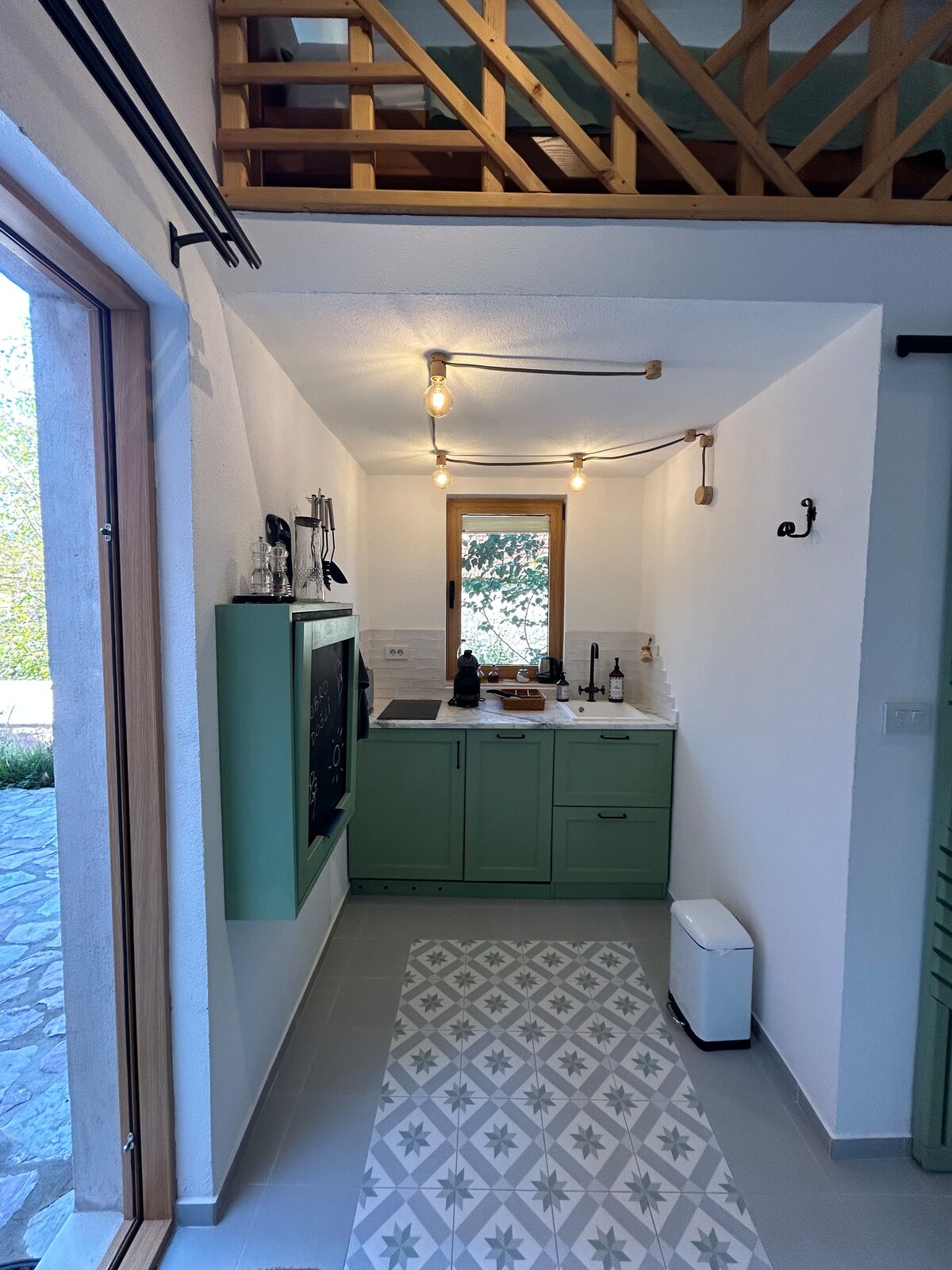 Das winzige Haus ist einfach und schön. Wir haben die starken Mauern des osmanischen Gebäudes aus dem 15. Jahrhundert in eine einzigartige Wohnung verwandelt. Zu deiner Verfügung steht ein Zimmer mit einem großen Bett, zwei Terrassen und einem Balkon mit herrlichem Meerblick. Zusätzlich gibt es Gemeinschaftsräume: eine große Terrasse mit Grill, Küche, Dusche, WC. Außerdem das ganze Dorf, das im 14. Jahrhundert erbaut wurde, mit 4 Kirchen, 2 alten Schulen, verlassenen und schönen Häusern und atemberaubender Aussicht auf Wälder, Berge und das Meer.