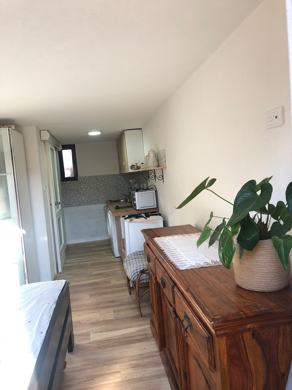 Dies ist eine Erdgeschosswohnung von 34 Quadratmetern. Sie ist sehr sonnig, voller Licht und sehr warm im Winter. Sie verfügt über einen Balkon mit Blick auf die Berge. Auf der gegenüberliegenden Seite befindet sich eine große Tür zum Innenhof. Sie ist mit viel Liebe und dem Wunsch ausgestattet, dass sich jeder darin wohlfühlt. Da ich einen Abschluss in Malerei habe, versuchte ich, meine Affinität für visuelle Kunst bei der Gestaltung dieses Raumes anzuwenden.