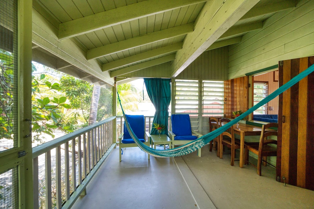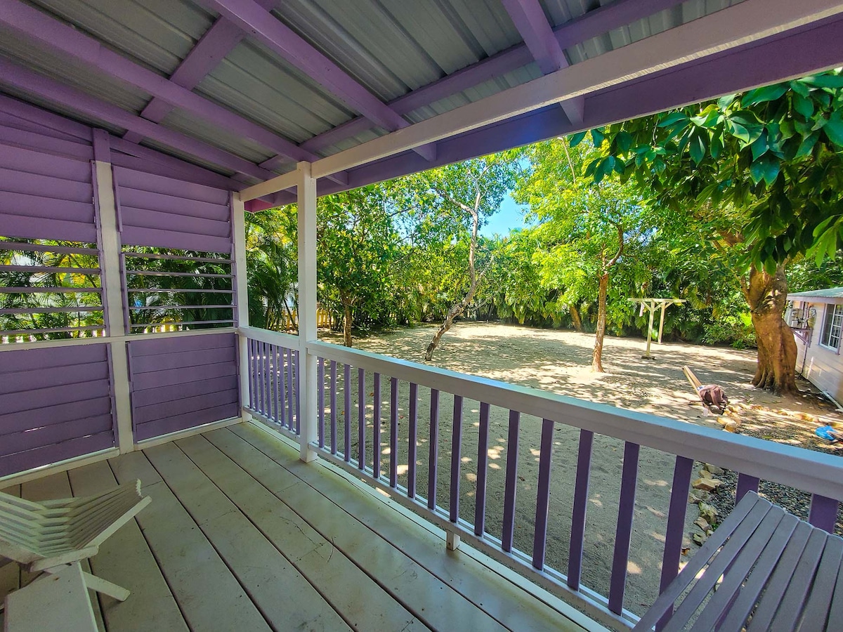 Stay in our stand alone cabana. Situated in the most private part of the property, is our cute purple cabana. Included is two full beds, a private porch, a kitchen, bathroom, television, and air conditioning. Included on the property is: daily cleaning of property, hammocks, gardens with picnic tables and seating, WIFI throughout the property and lots of shady from our mature trees.