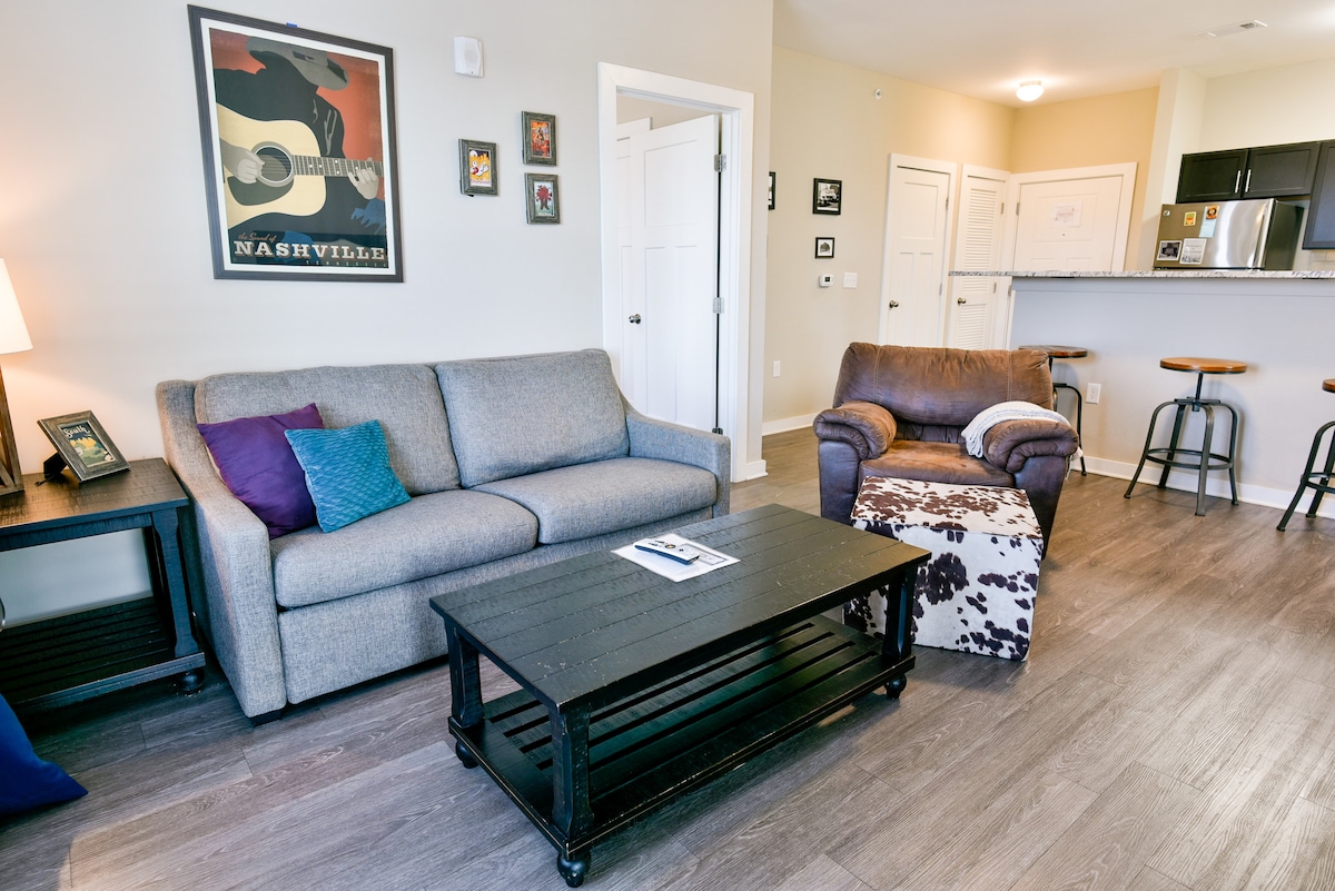 Diese 1-Zimmer-Eigentumswohnung in der Innenstadt hat einen urbanen Look mit trendigen West Elm-Möbeln und lokalen Nashville-Akzenten. Sie bietet ein Kingsize-Bett im Schlafzimmer und 1 Queensize-Ausziehsofa. Dieser Raum ist ideal für Geschäftsreisende und Paare. Für deine Bequemlichkeit bieten wir leichte Snacks und Kaffee. Wir bieten zwei große 50+ Zoll Smart-TVs. Wir bieten auch Glasfaser-Internet an, um deine Lieblingssendungen zu streamen. Unser Ziel ist es, dass du dich wie in deinem zweiten Zuhause fühlst. STRP-Genehmigung Nr. 2018072939.