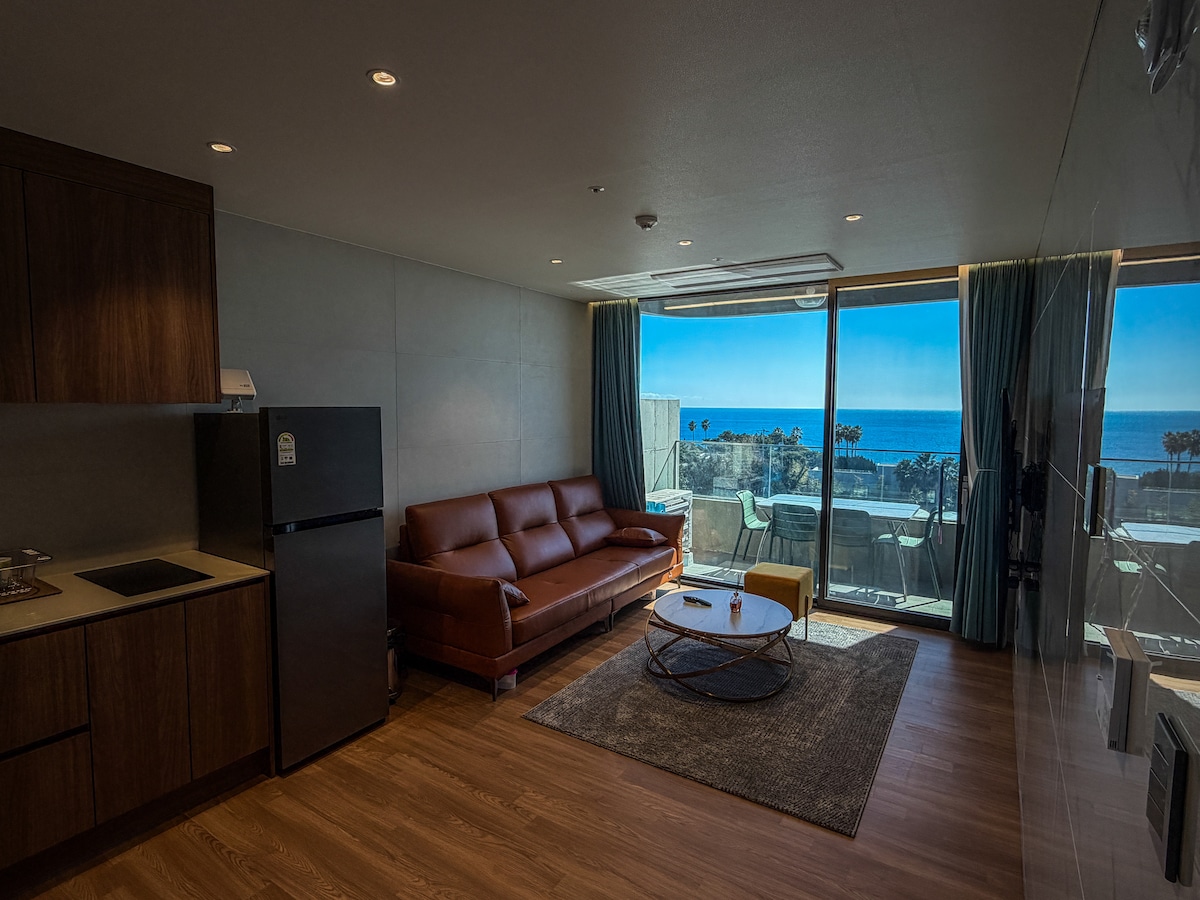 Hello. Perched on a cliff in central Seogwipo, this suite offers ocean views where islands and sea meet on one horizon. The 66㎡ private space keeps you apart from other travelers. Studio-style, yet spacious, with separate bedroom, living, and kitchen zones for an easy flow. On the terrace, soak in the spa and enjoy a private barbecue above the water. Free breakfast served with wide sea views. May to October, swim in the infinity pool facing Beomseom. The rooftop garden captures Jeju sunsets.