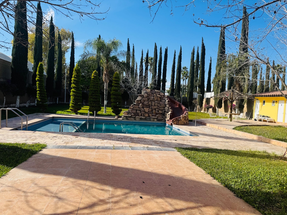Entspannen Sie sich in diesem ruhigen und einzigartigen Anwesen nördlich von Torreon, in der Nähe des TSM-Stadions. Nur 10 Minuten von der Stadt entfernt, werden Sie sich in der Ruhe dieses Raumes mit Pool, Grill und einem großen Garten, in dem Sie sich entspannen können, fühlen. Gemeinschaftliche Einrichtungen wie Pool, Palapa, Grill und Gärten. 10 Minuten von Galerias Laguna 5 Minuten vom Play Padel Club entfernt 5 Minuten vom Padel ONE Club entfernt Direkt gegenüber von EL CLUBSITO Padel- und Tennisclub. SCHNELLES WLAN!