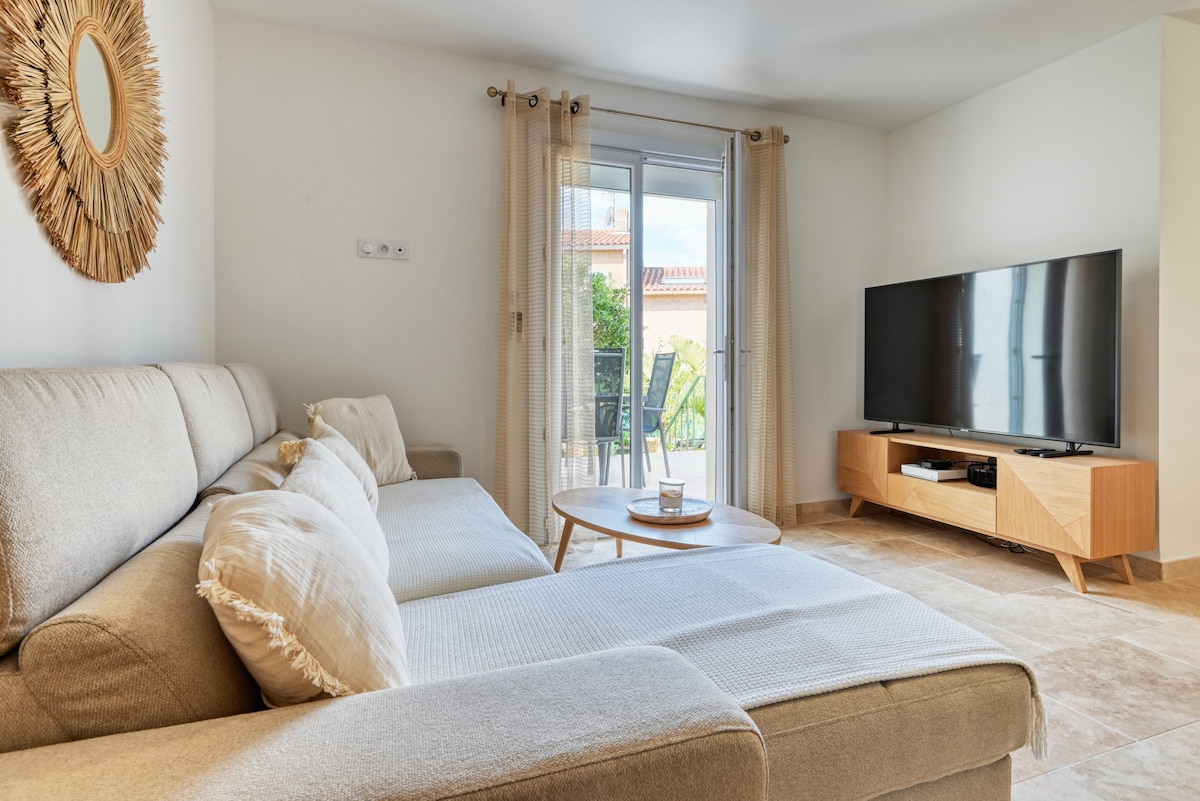 SIX-FOURS-LES-PLAGES - Villa NAYA Bienvenue dans notre maison rénovée (2024) style Bohème . Idéalement situé au calme à 20 min à pied du port de Sanary sur mer (plus beaux marché de France 2018) et 10 min à pied de la plage de Bonnegrâce. Pouvant accueillir jusqu'à 6 personnes maximum cette villa entièrement équipée et climatisée possède 3 chambres avec lit double ,une cuisine ouverte sur le salon donnant sur un jardin bien exposé avec une belle piscine (hors sol) Wifi (fibre), BBQ et parking