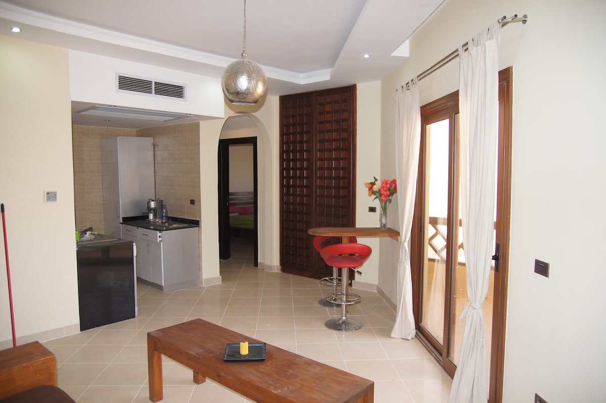 Luxury apartment with sea view in privacy compound in city center, with one bedroom has a king bed with balcony, full equipped kitchen, small living room with a big couch. The apartment is suitable for 3 adults or 2 adults with 2 kids, nice beach with amazing snorkeling area, 3 swimming pools, safety and has security's team, 500 meters from Marina yachts. several restaurants, and coffee around to make your visit easy to plan 😉. providing transfer, trips, entertainment activities services 😉