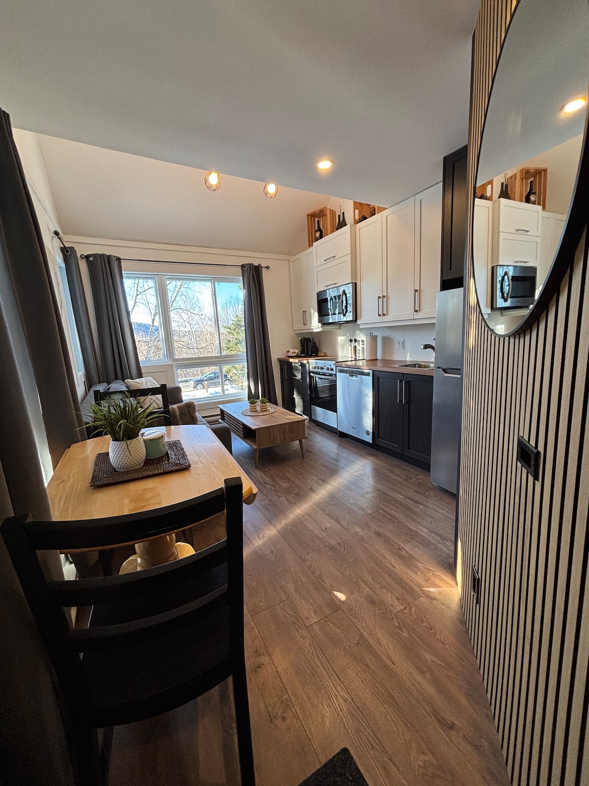 Ski-In/Ski-out-Wohnung mit einem schönen Blick auf den Fluss. Ruhe, aber nur 1 Minute zu Fuß von allem, was das Resort zu bieten hat: Restaurants, Einkaufsmöglichkeiten und viele Aktivitäten. Schöne voll ausgestattete Küche. Klimaanlage (nur im Sommer) und ein an der Wand montierter elektrischer Kamin. 30-Zoll-Fernseher mit Kabelanschluss Cogeco, WLAN inklusive. Parkplatz direkt vor der Wohnung inklusive. Geschlossenes Schlafzimmer mit Doppelbett. Schlafsofa im Wohnzimmer. Ideal für ein Paar oder für Familien mit bis zu 4 Personen.