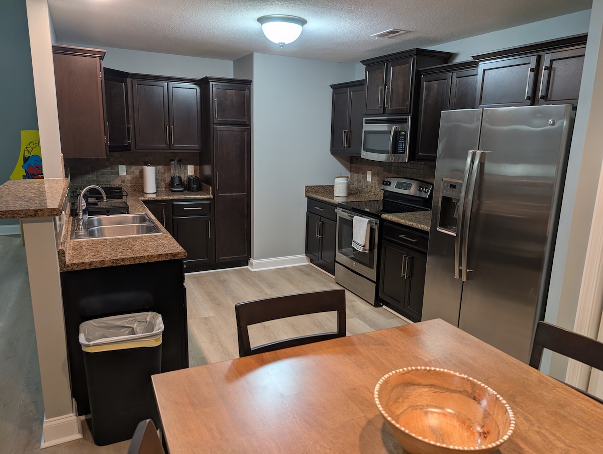 Kick back and relax in this calm, stylish space. With 2 living rooms & an outdoor living area, there will be plenty of space for you to spread out and get comfy. New 65" Smart TV & long comfy couch - perfect for movie nights with the whole group! Local Attractions- 5 miles from Downtown Clarksville (~10min) 15 miles from Fort Campbell (~30min) 45 miles from Downtown Nashville (~45min)