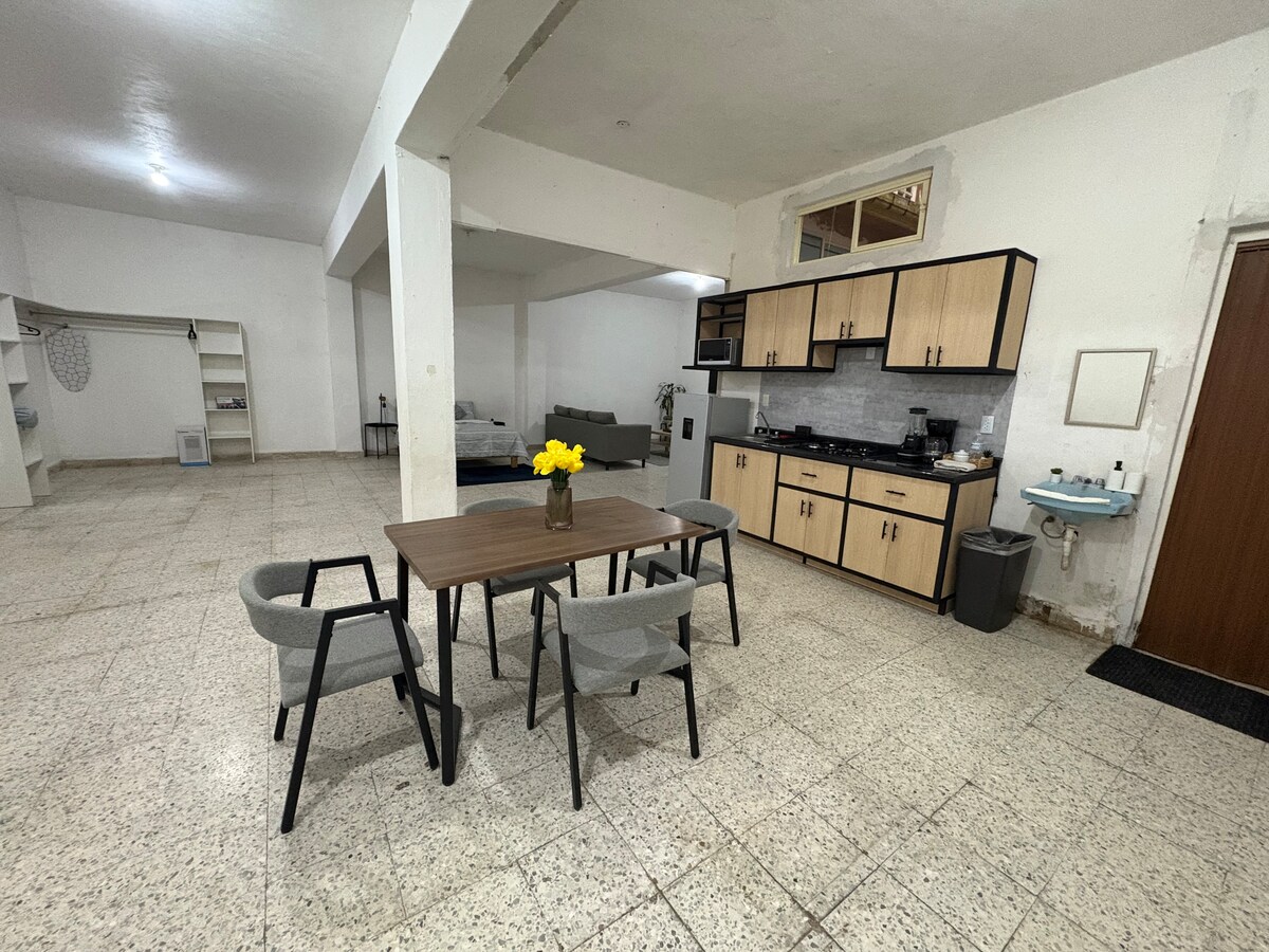 Gemütliches Loft in einer privaten Wohnanlage, perfekt zum Entspannen nach einem langen Tag. Im Obergeschoss finden Sie ein Doppelbett, einen großen Kleiderschrank, Fenster mit Blick auf den Garten und eine private Terrasse. Unten gibt es eine voll ausgestattete Küche, ein komplettes Badezimmer, eine Waschmaschine/einen Trockner, ein Schlafsofa und einen Loungesessel. Ideal für kurze oder längere Aufenthalte. Wenn Sie echte mexikanische Gastfreundschaft erleben möchten, ist dies der perfekte Ort.