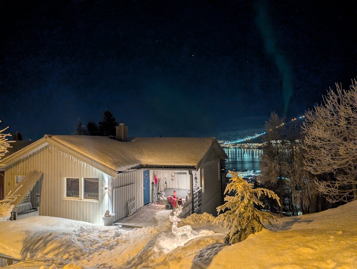 3-stöckiges Haus mit riesigen Fenstern über der Stadt. (Verfügt über ein türkisches Dampfbad-Spa) Die Dachterrasse bietet dir einen 360-Grad-Blick auf alle umliegenden Berge. Darüber hinaus perfekte Bedingungen, um die Nordlichter in der Nacht zu bewundern. Das Haus befindet sich 1,2 km vom Zentrum von Tromsø entfernt, Bus vom Zentrum zum Haus (5 Minuten). Es verfügt über 2 Schlafzimmer auf 1 Etage (4 Personen) und eine große Couch (Schlafen) im Wohnzimmer auf der 2. Etage. Die 3. Etage ist Waschmaschine und Trockner mit Eingang zur Terrasse. Einzigartiger Holzstil, 70 m²