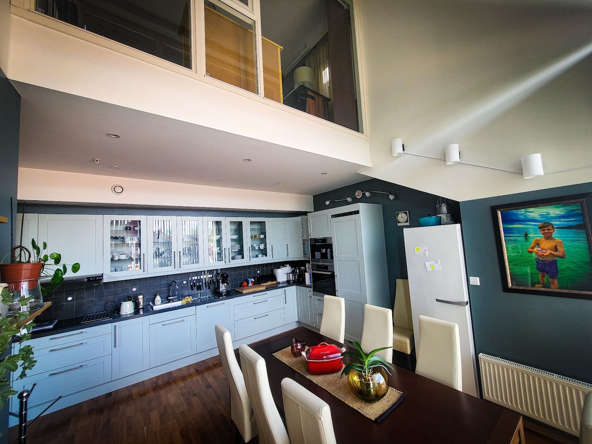 Nyt fantastisk panoramautsikt fra en nyoppusset og romslig leilighet over to etasjer, 2.etasje og loft. Beliggende landlig og fredelig på Ranheim, med to solrike terrasser. Kort vei til marka og kun 10 min til Trondheim sentrum. Leiligheten har tre soverom og en sovesofa, plass til opptil 8 personer. Perfekt for familier eller vennegrupper som ønsker komfort, ro og nærhet til både natur og by. Gratis parkering, elbil-lader, WiFi, fullt utstyrt kjøkken, to stuer, sengetøy og håndduker inkludert.