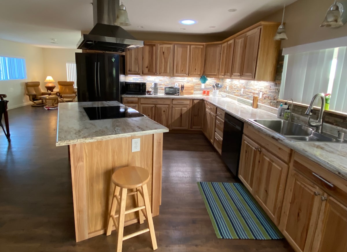Geräumiges, sonnendurchflutetes Haus an der Seite des Butte, umgeben von einer wunderschönen, 3,2 Hektar großen, üppigen Sonora-Wüste. Tritt auf eine private Terrasse, um morgens Kaffee zu trinken oder abends zu speisen, und lass deine Sinne für die Sehenswürdigkeiten und Klänge der Wüste und ihrer Schönheit wecken. Die gesamte Unterkunft steht dir zur Erkundung und zum Genießen zur Verfügung, mit einem privaten Wanderweg, auf dem du zu den Höhen wandern kannst, um eine hundert Meilen lange Aussicht zu genießen. Das Haus liegt auf einer Anhöhe und große Fenster bieten einen 360-Grad-Blick. Lass dich inspirieren!