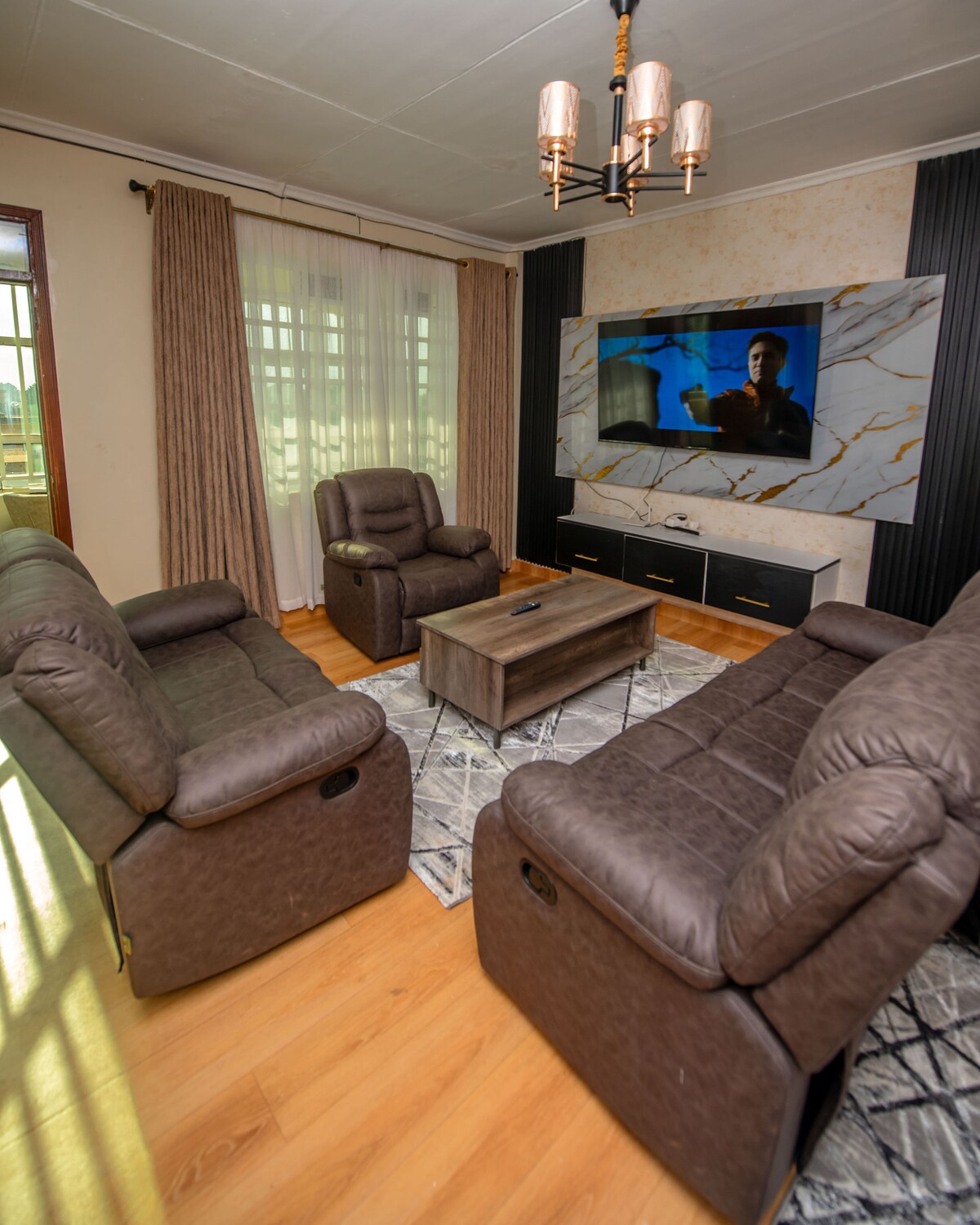 Willkommen in unserem BnB mit 3 Schlafzimmern und 2 Bädern in einer ruhigen Gegend. Das Haus bietet einfachen Zugang zum Flughafen und zur Stadt Eldoret und verfügt über ausreichend Parkplätze. Genieße den selbstständigen Check-in, schnelles WLAN und einen Smart-TV im geräumigen Wohnzimmer. Das Hauptschlafzimmer verfügt über ein eigenes Bad und es gibt eine voll ausgestattete Küche mit Zugang zu einem Hinterhof. Die Gäste haben Zugang zu einem gemeinschaftlich genutzten Pool und Fitnessraum. Der Gastgeber steht für Hilfe zur Verfügung. Genieße während deines Aufenthalts Komfort, Sicherheit und Bequemlichkeit.