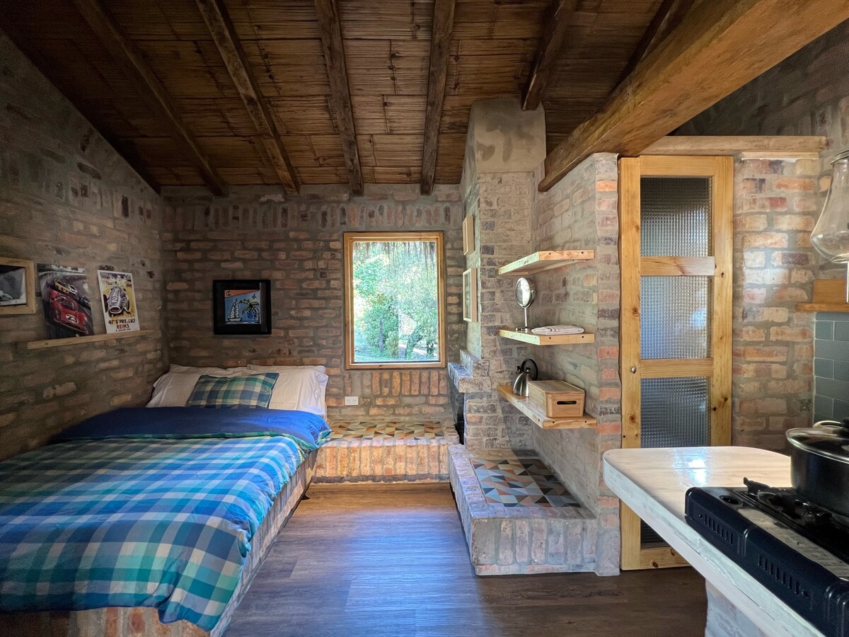 Frühstück inklusive - MINI 12 Quadratmeter Kabine aus Ziegel und Holz, sehr gemütlich mit kleiner Küche und eigenem Bad für Ihren Komfort - Diese Kabine befindet sich am Eingang des Grundstücks und hat keinen Blick auf den Stausee.