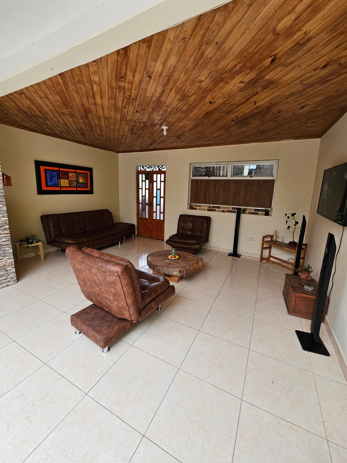 Villa de los Juanes ist ein perfekter Rückzugsort zum Entspannen und Verbinden mit der Natur. Unser gemütliches Haus bietet zwei unabhängige Zimmer mit Doppelbetten, ein Esszimmer, ein Badezimmer mit elektrischer Dusche, ein Arbeitszimmer, eine voll ausgestattete Küche, eine Außenterrasse mit Grill, einen privaten Parkplatz und 3.400 Quadratmeter Grünfläche. Wir bieten schnelles WLAN, Fernseher, Bücher und Brettspiele. Lass dich von der Ruhe verzaubern, die dieser schöne Ort inspiriert. Nur eine 10-minütige Fahrt von Villa de Leyva (5 km) entfernt.