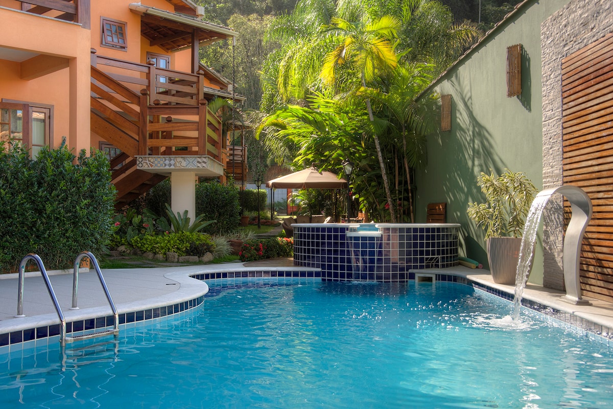 Relaxe neste lugar único e tranquilo. Cercado pela Mata Atlântica e embalado pelo som do riacho, aqui a sensação é de paz e tranquilidade. Estamos localizados em uma travessa da rua principal de Trindade, a 5 minutos a pé do comercio local e 7 minutos das principais praias.