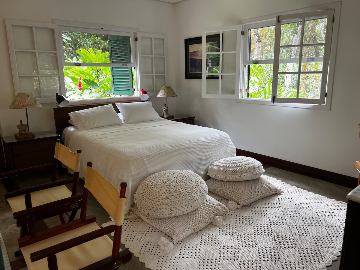 In einer edlen, bewaldeten und sicheren Gegend von Paraty gelegen, bietet Ihnen unser Chalet ein einzigartiges Erlebnis der Integration in die Umgebung. Ideal für einen Kurzurlaub in Ruhe. Nur 5 Autominuten vom historischen Zentrum und 25 Minuten zu Fuß entfernt, genießt unser Chalet eine strategische Lage. Es ermöglicht einen direkten Zugang zur Straße zu den Stränden und vermeidet so die Staus des Stadtzentrums in der Hochsaison.