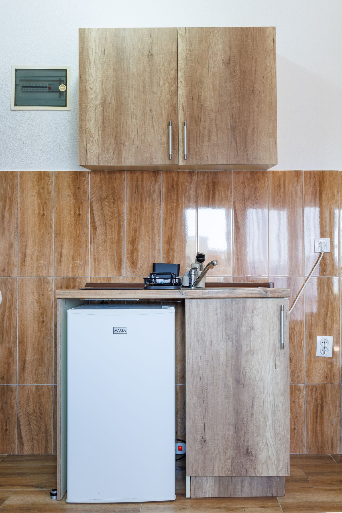 Dieses klimatisierte Studio verfügt über einen Balkon mit Meerblick und einen Essbereich, eine Küche mit Herd, einen Minikühlschrank, einen Wasserkocher und Geschirr. Die Unterkunft verfügt über ein Doppelbett, ein eigenes Bad mit Duschkabine und Haartrockner, kostenloses WLAN und einen Fernseher. Gäste haben auch Zugang zu: einem Außenpool, einem privaten Betonstrand mit direktem Treppenzugang zum Meer, kostenlosen Sonnenliegen und Sonnenschirmen, einer gemeinsamen Terrasse mit Blick auf den Sonnenuntergang, einem Parkplatz pro Wohnung