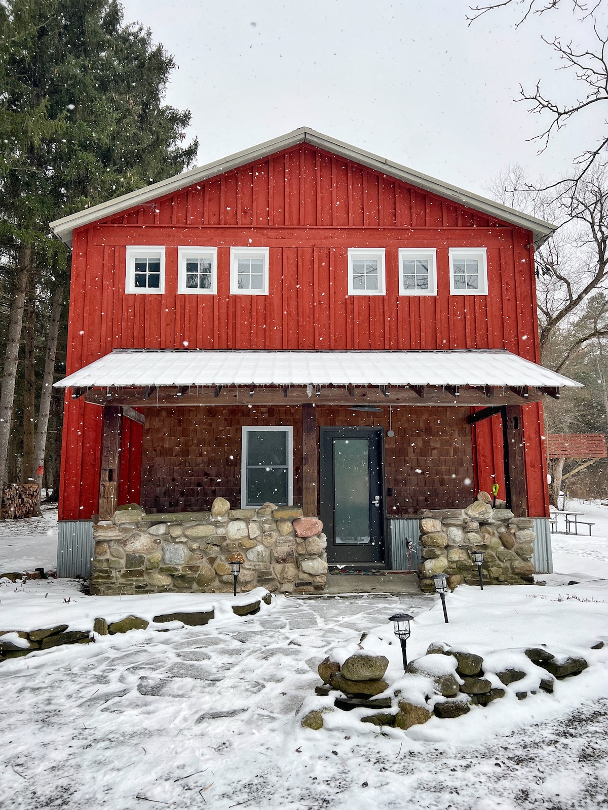 Experience luxury at Barn Manor, a converted barn surrounded by fields and forests. Relax in a jetted tub with heated floors, enjoy fireside evenings, and admire custom woodwork, marble accents, indoor hammock and unique windows. Both levels are open floor plans: the first floor has a queen bed, full kitchen, living space, and bathroom; upstairs offers a king bed with Casper mattress, queen futon, and optional fold-out twin. Sleeps up to 8. Ask about long-term winter stays.