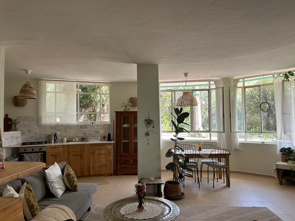 A beautiful and spacious loft with an amazing view of a natural grove. A sense of life within nature in complete privacy. Located in the Jezreel Valley in the Lower Galilee. The loft is well equipped and comfortable for a long stay. There are a number of charming seating areas in the garden and on the terrace. Close to beautiful hiking and bicycle trails. A great place for artists and writers.