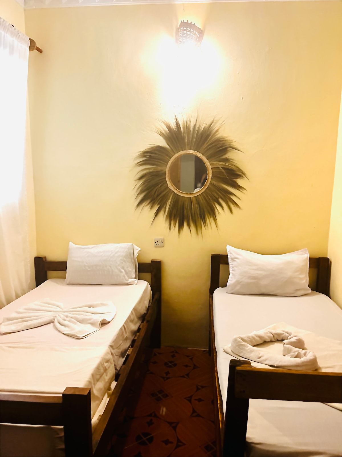 Zwei Villen sind 2 Drei-Bett-Villen Ost, West und. Dieses Inserat ist für die private Ostvilla mit zusätzlicher Gemeinschaftsküche und einem geräumigen Obergeschoss zum Entspannen. Frühstück inbegriffen, es gibt einen privaten Pool, der alle Stunden geöffnet ist, den du genießen kannst. Du kannst andere Gäste aus der West Villa haben oder nicht, mit denen du den Gemeinschaftsraum teilen kannst oder nicht. Wir befinden uns im Zentrum von Jambiani, in der Nähe aller beliebten Bars und Restaurants und Annehmlichkeiten und 5 Fahrminuten von Paje entfernt.