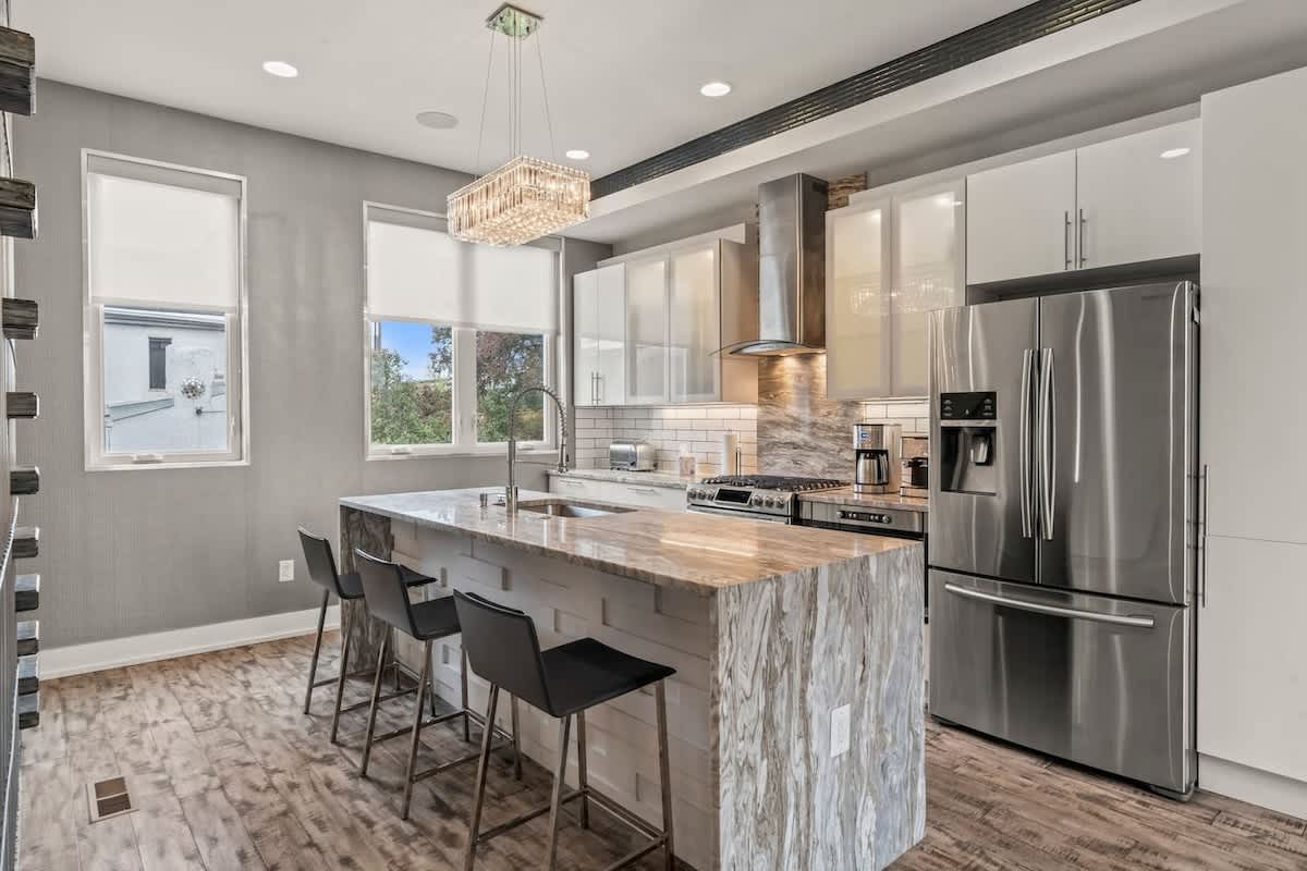 Genieße Philadelphia in diesem zentral gelegenen ultramodernen Haus. Du musst dir keine Sorgen um das Parken machen. Wenn du an deiner Ankunft ankommst, fährst du in deine Garage und gehe rein! Es gibt viel Platz für alle. Diese Unterkunft verfügt über 5 Etagen Wohnfläche. Du wirst von einem Baby Grand Piano begrüßt, wenn du das Wohnzimmer betrittst. Es gibt eine hintere Terrasse abseits der 1. Etage und eine Dachterrasse mit Blick auf die Skyline und die Brücke. Im Keller findest du dein eigenes Kino. Nicht genug unterhalten? Wie wäre es mit einer Arcade-Lobby?!