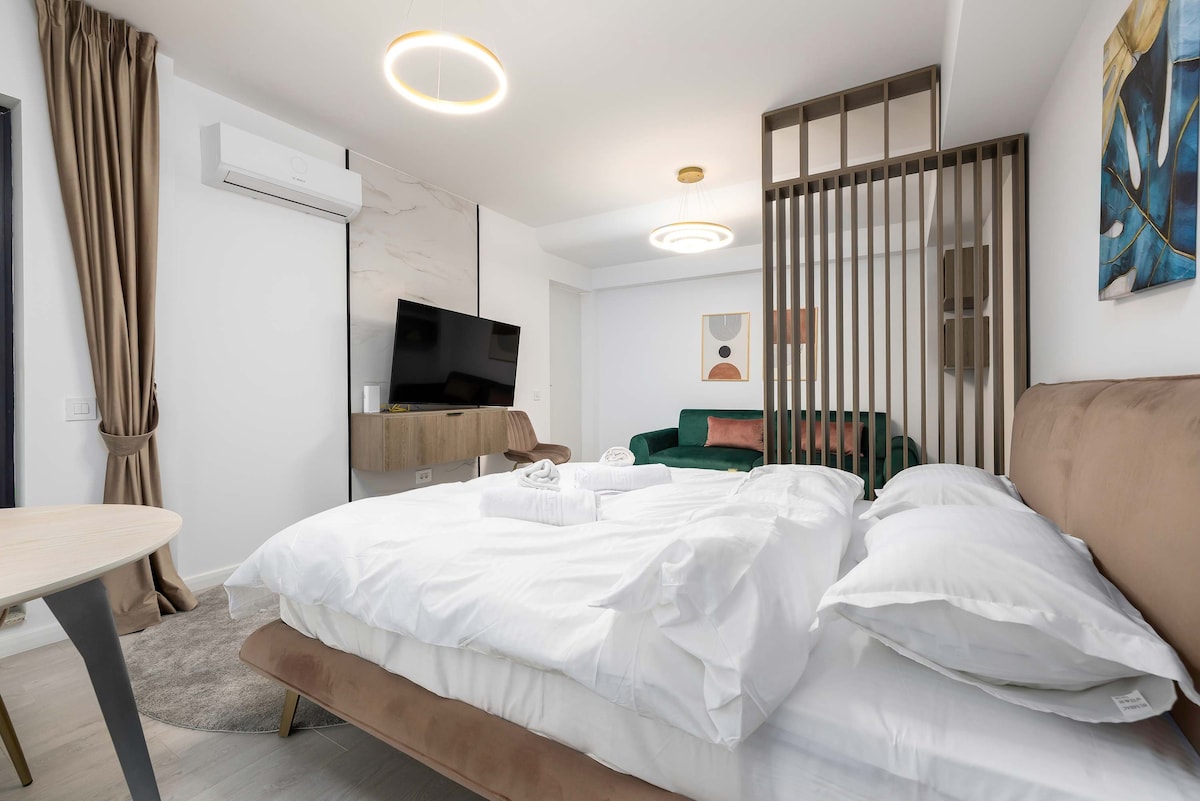 - Erstklassige Lage: Zentral gelegen mit einfachem Zugang zu den Hauptattraktionen von Bukarest, aber dennoch in einer ruhigen Gegend für erholsame Nächte eingebettet. - Premium-Komfort: Genieße ein gemütliches, hochwertiges Bett für einen erholsamen Schlaf und einen 55-Zoll 4K-UHD-QLED-Smart-TV für deine Unterhaltung. - Voll ausgestattete Küche - Sauberkeit garantiert: Engagiertes Reinigungspersonal -> tägliche Sauberkeit. - Parkplatz auf unserem Parkplatz (CCTV).