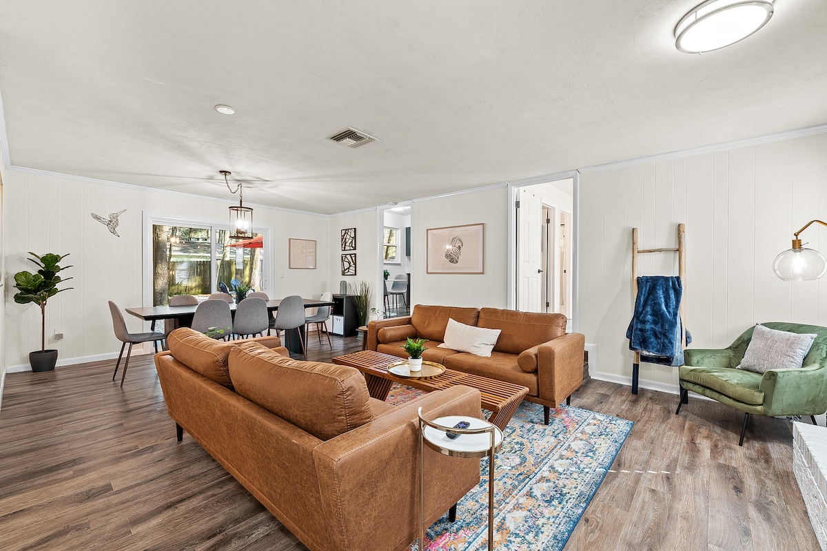 Delightful and relaxing design with wonderful hospitality! Centrally located value in the heart of all Gainesville has to offer ☀️ Double-ensuite floor plan (1 king & 1 queen) with central living spaces ☀️ Private fully-fenced backyard ☀️ String lights and private gas firepit ☀️ Vaulted ceilings & well-equipped kitchen ☀️ High-end, comfortable mattresses and linens ☀️ High Speed Wi-Fi & desk for remote work ☀️ Single level, no stairs ☀️ PET-FRIENDLY ☀️ 2 miles from UF, Ben Hill Stadium & Shands