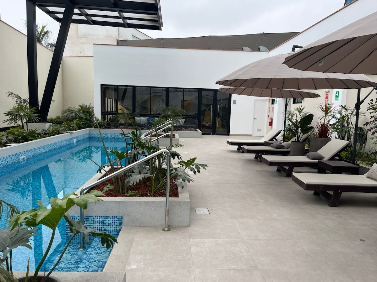 Wohnung in Barranco in modernem Gebäude mit Meerblick, ideal für 2, bis zu 4 Personen. Zugang zum Pool auf der Dachterrasse, Whirlpool, Yoga- und Coworking-Bereichen (Mindestaufenthalt 2 Nächte). 5 Gehminuten vom Strandpromenade, 15 Gehminuten vom Boulevard Barranco und dem Hauptplatz, Nachtclubs und Restaurants mit dem besten peruanischen Essen entfernt. Kostenlose Parkplätze an der Straße je nach Verfügbarkeit. WLAN mit hoher Geschwindigkeit.