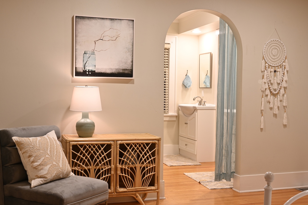 Indulge your senses in this spotless and stunning open-plan (no walls) designer space with over 575 five star reviews. Large soaker bathtub, soothing electric fireplace, chef's kitchen, remote work station, & covered patio. * This unit is located on the bottom floor of our home, (but a completely separate dwelling.) Please EXPECT to hear daily family activities above you, like walking & talking. If household sounds will disturb you, please do NOT book this listing. * No kids under 12 please