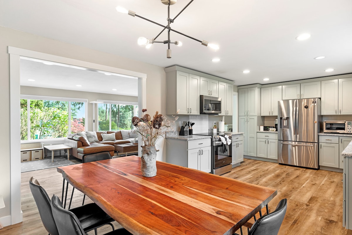 Genieße einen perfekten Aufenthalt in dieser gemütlichen und geräumigen Unterkunft mit 4 Betten/ 3 Bädern in Bellevue/ Renton, perfekt für Familien und große Gruppen, die einen Wochenendausflug oder einen Langzeitaufenthalt suchen. Dieses 3000 Quadratfuß große Haus liegt am Fuße des Cougar Mountain in einer ruhigen Gegend und verfügt über ein Fitnessstudio, um deine Fitness am Laufen zu halten, Spielzimmer für Familienzeit, ist in der Nähe von Wandern, Golfen, Weltklasse-Shopping, Schwimmen und Skifahren! Tanken Sie abends neue Energie auf Ihrer eigenen Avocado-Matratze, der Matratze mit der Nummer1 in den Verbraucherberichten.
